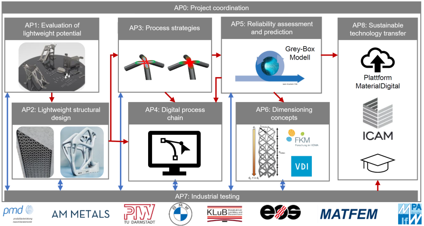 The aim of the project is to demonstrate the industrial applicability of topologically optimized design and structurally integrative use of lattice structures in quasi-static, dynamically and cyclically loaded components using L-PBF technology. The basis for this is the reproducible, automated generation of lattice structures and a determination of validated material parameters for specific lightweight structures. The central solution approach in both areas is the combination of physically-based models (white-box) with data-based machine learning methods (black-box) in near real-time capable grey-box models for the implementation of innovative targeted manufacturing and dimensioning concepts. It is crucial to be able to predict local material and component behavior, generated by peculiarities of the additive manufacturing process, and to take them into account in the design or construction and calculation. The focus with regard to the load shape should be on the cyclic material behavior. Depending on the component's area of application, however, the static design strength and the plastic deformation and failure behavior in misuse and crash load cases must also be considered. Only a comprehensive evaluation of the loads on a component using CAE methods will allow effective and targeted optimization. To develop and test the method, investigations are carried out on lightweight structures made of various aluminum alloys. As a result, design and manufacturing concepts will contribute to the reduction of market entry barriers and will be further communicated both through influence in standardization and in workshops for practical application.