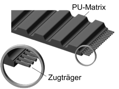 Hochleistungszahnriemen aus Polyurethan werden in einer Vielzahl von industriellen Anlagen zur bewegungstreuen Übertragung eingesetzt. Die Zugträger, welche sich aus Stahlseilen zusammensetzen, sind von einer Polyurehtan-Matrix umschlossen, welche die Zähne bildet, vgl. Abbildung 1.