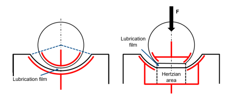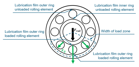 In a first step, the position and kinematics of unloaded rolling elements outside the load zone are investigated and their influence on the impedance model is determined (Figure 2, left). The knowledge gained will be extended to the boundary regions outside the Hertzian area of loaded rolling elements (Figure 2, right). Thus, the working hypothesis will be investigated that a correction factor, which is widely used in the literature and which includes the edge influence, can be replaced with the help of a complete description of all impedance contributions. For the subsequent test execution, the range of the bearing life must first be identified in which a constant electrical behavior of the bearing can be expected, because a change in bearing impedance can be observed both in the running-in phase and towards the end of the service life. This is followed by a detailed and statistically validated experimental design in which bearing type, speed, equivalent bearing load, load angle, measurement frequency and oil temperature are varied. Finally, the previously developed impedance model is to be validated based on the experimental results, thus enriching the scientific community with new knowledge of electrical bearing properties. In addition to its application in sensing rolling bearings, it can also help, e.g., in the prediction of the electrical behavior of electrical machines during operation in order to avoid failures caused by damaging bearing currents.