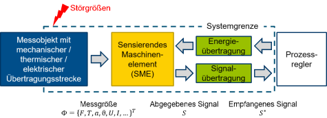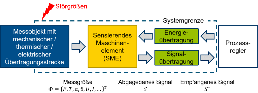 Die Integration sensorischer Funktionen in genormte oder standardisierte Maschinenelemente stellt einen vielversprechenden Ansatz zur direkten Messung relevanter Prozess- oder Zustandsgrößen in technischen bzw. mechatronischen Systemen dar. Diese sogenannten sensierenden Maschinenelemente (SME) ermöglichen ein tieferes Verständnis des Systemverhaltens sowie der vorherrschenden Betriebsbedingungen. Durch die direkte Messung relevanter Prozess- und Zustandsgrößen an ihrem Entstehungsort im System, der sog. In situ Messung, wird auftretende Unsicherheit grundsätzlich reduziert. Die Signalübertragungsstrecke einer Messgröße von ihrem Entstehungsort im mechatronischen System über das sensierende Maschinenelement bis hin zum empfangenden Prozessregler ist schematisch in Abbildung 1 dargestellt.
