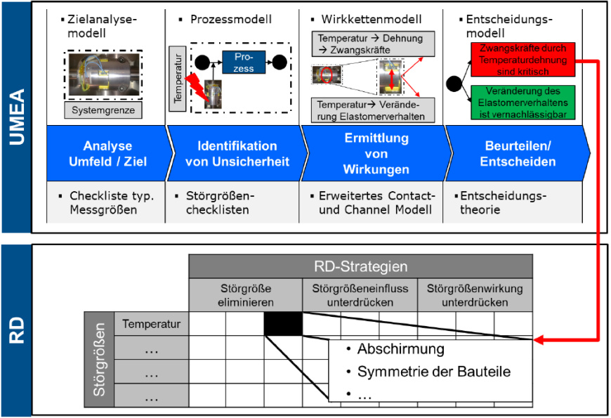 Zunächst wird die bereits am pmd entwickelte UMEA-Methodik zur Analyse von Unsicherheit in lasttragenden Systemen hinsichtlich der darin enthaltenen Methoden und Modelle erweitert, um Störgrößen, die auf die gesamte Übertragungsstrecke der Messgröße einwirken, identifizieren sowie deren Einfluss und Wirkung auf das am Prozessregler empfangene Signal S* qualitativ beschreiben zu können. Daran anschließend werden Robust-Design (RD) Hinweise zur Synthese von mechatronischen Systemen mit integrierten SME erarbeitet, die eine Beherrschung der aus den einwirkenden Störgrößen resultierenden Unsicherheit ermöglichen. Im nächsten Schritt werden die entwickelten Methoden und Modelle zur Analyse auftretender Unsicherheit sowie die erarbeiteten RD-Hinweise in einer übergeordneten Methodik zusammengeführt und aufeinander abgestimmt. Das Ergebnis ist eine Methodik, deren Anwendung die robuste Integration von SME in mechatronische Systeme absichert. Das Vorgehen dieser resultierenden Methodik ist in Abbildung 2 anhand eines mechatronischen Systems mit einer integrierten sensierenden Ausgleichskupplung illustriert.
